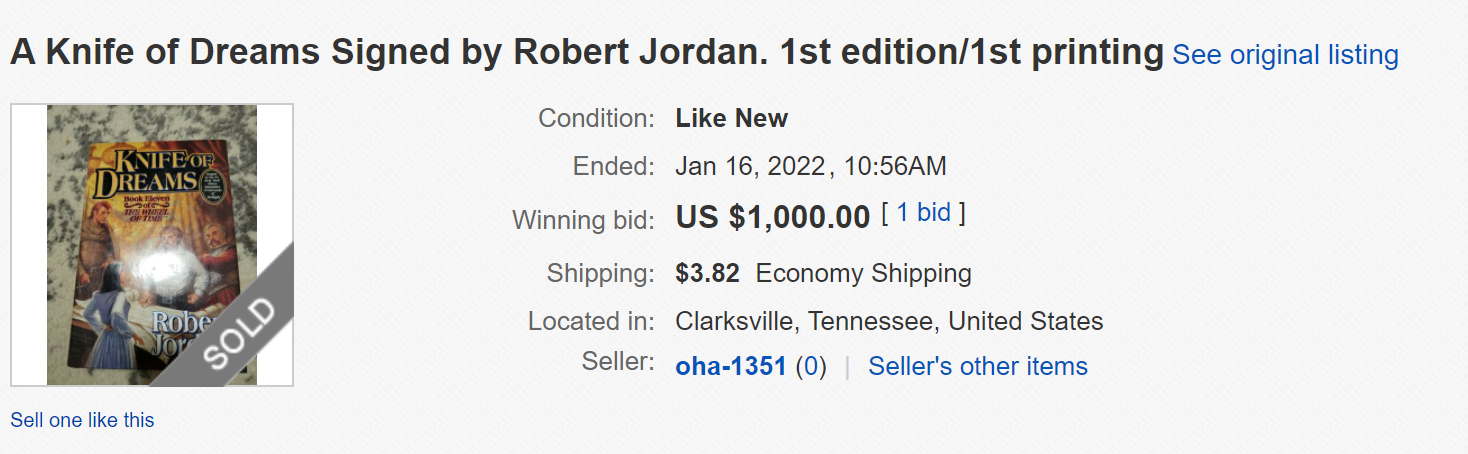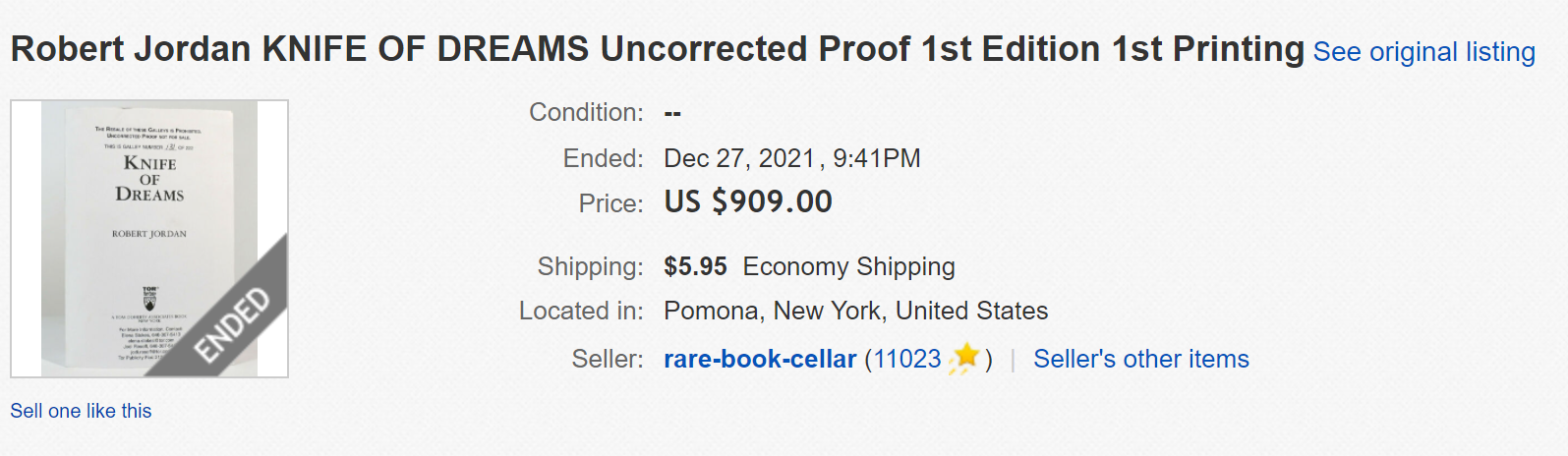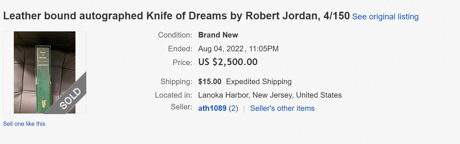 Price HistoryNote: We are continuously adding more listings to this page. $1,000.00 January 16, 2022First Edition, First Printing of Knife of Dreams in Like New condition. Signed on the title page. $909.00 December 27, 2021Uncorrected Proof in Very Good condition. $2,500.00 August 4, 2022Limited Edition Leatherbound Knife of Dreams in Like New condition. $1,800July 18, 2022Limited Edition Leatherbound Knife of Dreams in Very Good condition. Note that there is a long scratch on one side of the slipcase.