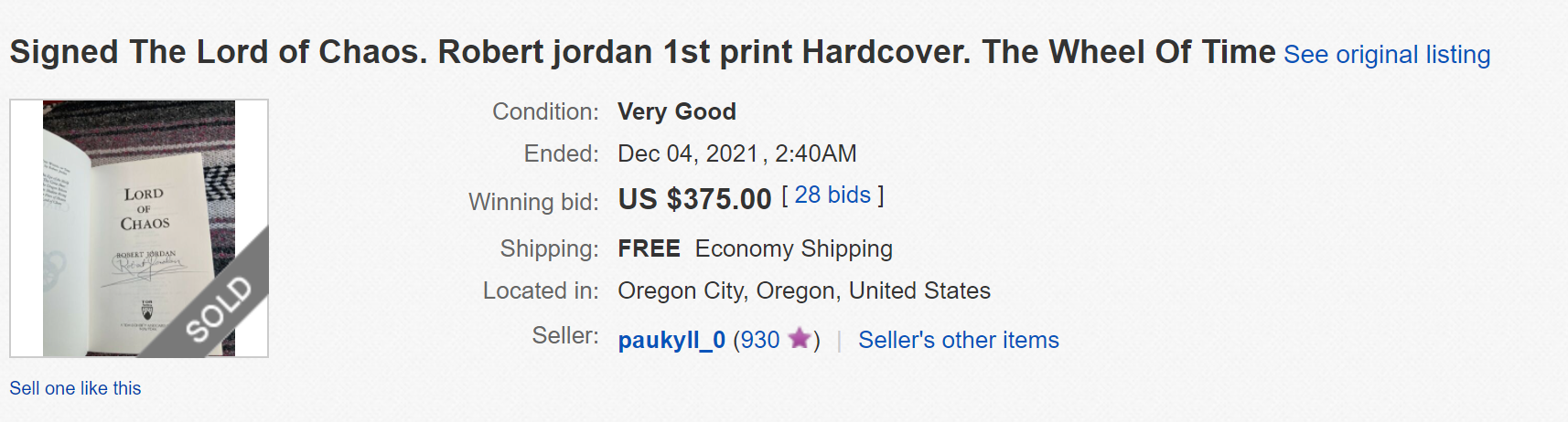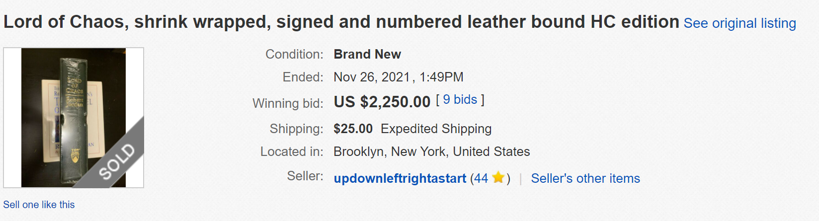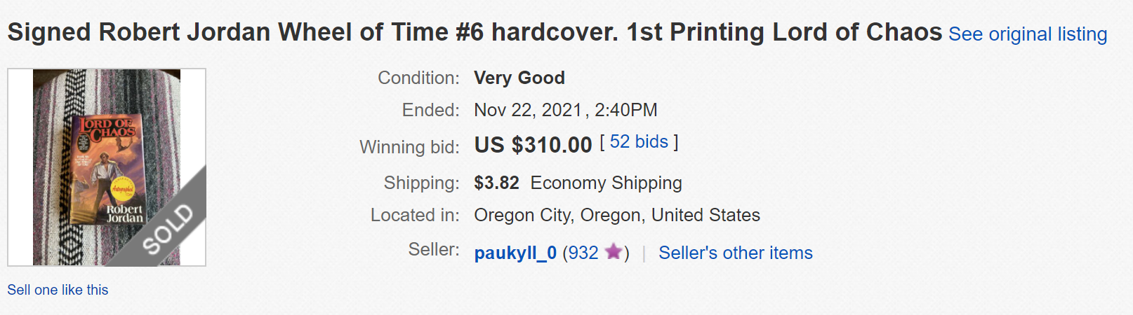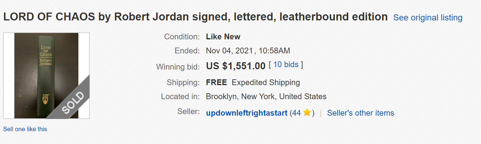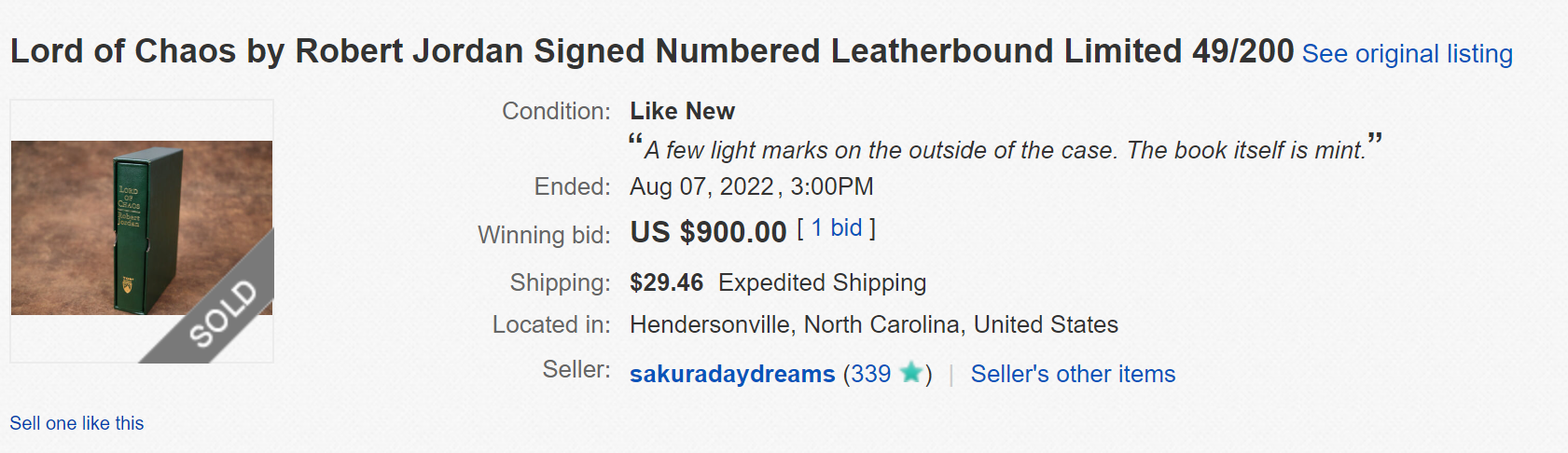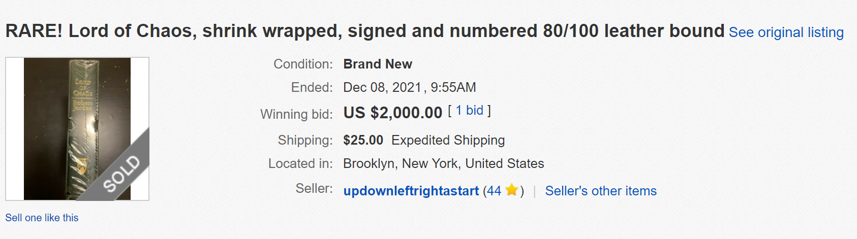 Price HistoryNote: We are continuously adding more listings to this page. $2,250.00 November 26, 2021Limited Edition Leatherbound in Brand New Condition. Signed and shrink wrapped. $2,000.00 January 7, 2022Limited Edition Leatherbound in Brand New Condition. Signed and shrink wrapped. $1,026.00 June 30, 2022Limited Edition Leatherbound of The Lord of Chaos in Brand New (sealed) condition. Signed. $900.00 August 7, 2022Limited Edition Leatherbound of The Lord of Chaos in Like New condition. Signed. $500.00 June 21, 2022First Edition, First Printing of The Lord of Chaos in Like New condition. Signed. $350.00 August 24, 2022First Edition, First Printing of The Lord of Chaos in good condition. Signed. $260.00 December 12, 2021First Edition, First Printing in Like New condition. Signed and inscribed on title page. $375.00 December 4, 2021First Edition, First Printing in Very Good condition. Signed on the title page. Previous owner’s name written on inner map page. $2,000.00 December 8, 2021Limited Edition Leatherbound in Brand New condition. Sealed. $1,551.00 November 4, 2021Limited Edition Leatherbound in Like New condition. $310.00 November 22, 2021First Edition, First Printing in Very Good condition. Signed on the title page. Sticker is present on the front. $202.50 January 12, 2022First Edition, First Printing in Very Good condition. Signed on the title page. $300.00 January 16, 2022First Edition, First Printing in Like New condition. Signed on the title page. $1,200.00 February 27, 2022Limited Edition Leatherbound in Very Good condition. Sealed. $500.00 June 21, 2022First Edition, First Printing of Lord of Chaos in Like New condition. Signed on the title page.