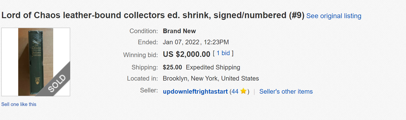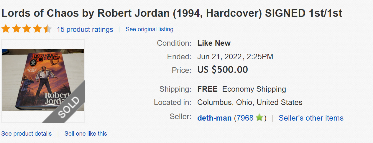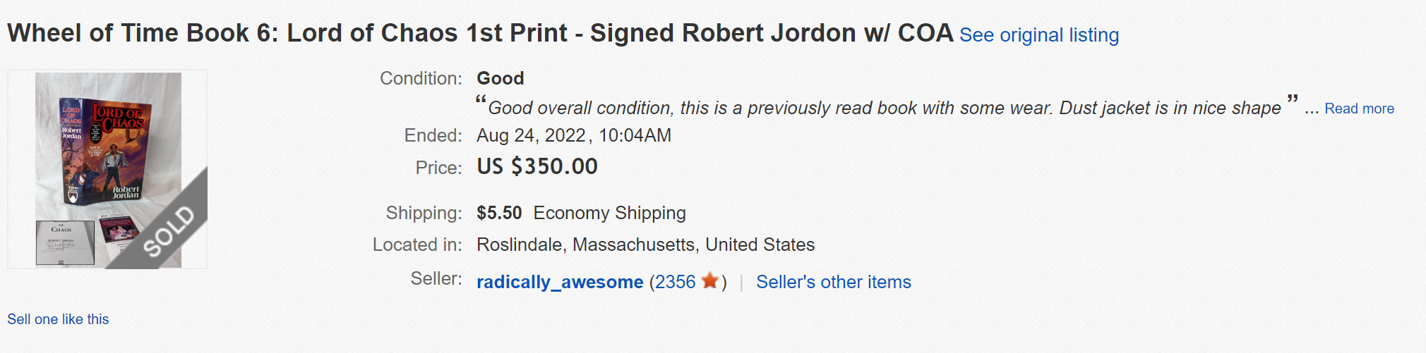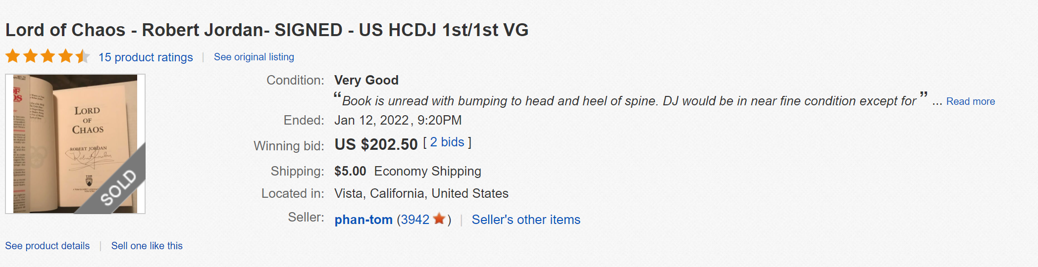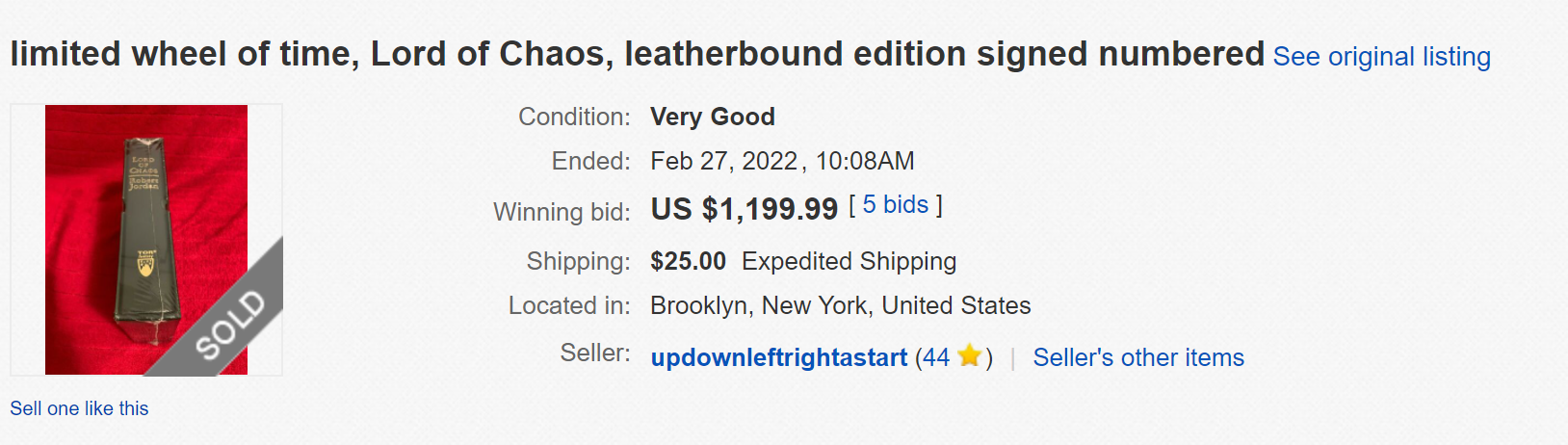 Price HistoryNote: We are continuously adding more listings to this page. $2,250.00 November 26, 2021Limited Edition Leatherbound in Brand New Condition. Signed and shrink wrapped. $2,000.00 January 7, 2022Limited Edition Leatherbound in Brand New Condition. Signed and shrink wrapped. $1,026.00 June 30, 2022Limited Edition Leatherbound of The Lord of Chaos in Brand New (sealed) condition. Signed. $900.00 August 7, 2022Limited Edition Leatherbound of The Lord of Chaos in Like New condition. Signed. $500.00 June 21, 2022First Edition, First Printing of The Lord of Chaos in Like New condition. Signed. $350.00 August 24, 2022First Edition, First Printing of The Lord of Chaos in good condition. Signed. $260.00 December 12, 2021First Edition, First Printing in Like New condition. Signed and inscribed on title page. $375.00 December 4, 2021First Edition, First Printing in Very Good condition. Signed on the title page. Previous owner’s name written on inner map page. $2,000.00 December 8, 2021Limited Edition Leatherbound in Brand New condition. Sealed. $1,551.00 November 4, 2021Limited Edition Leatherbound in Like New condition. $310.00 November 22, 2021First Edition, First Printing in Very Good condition. Signed on the title page. Sticker is present on the front. $202.50 January 12, 2022First Edition, First Printing in Very Good condition. Signed on the title page. $300.00 January 16, 2022First Edition, First Printing in Like New condition. Signed on the title page. $1,200.00 February 27, 2022Limited Edition Leatherbound in Very Good condition. Sealed. $500.00 June 21, 2022First Edition, First Printing of Lord of Chaos in Like New condition. Signed on the title page.