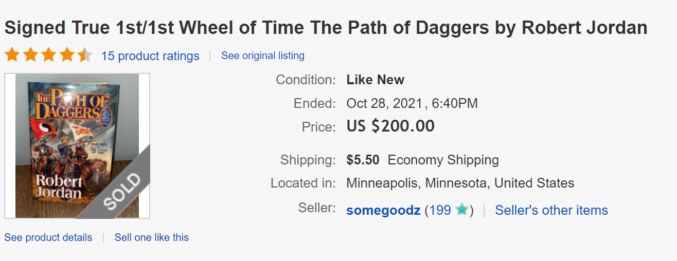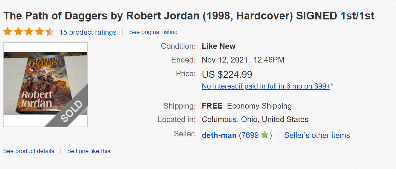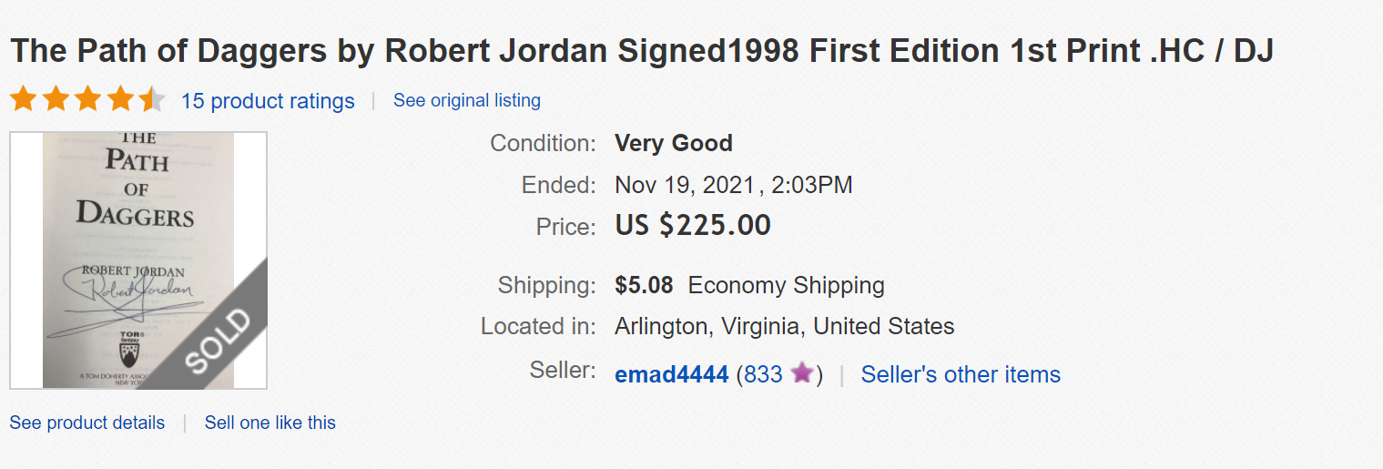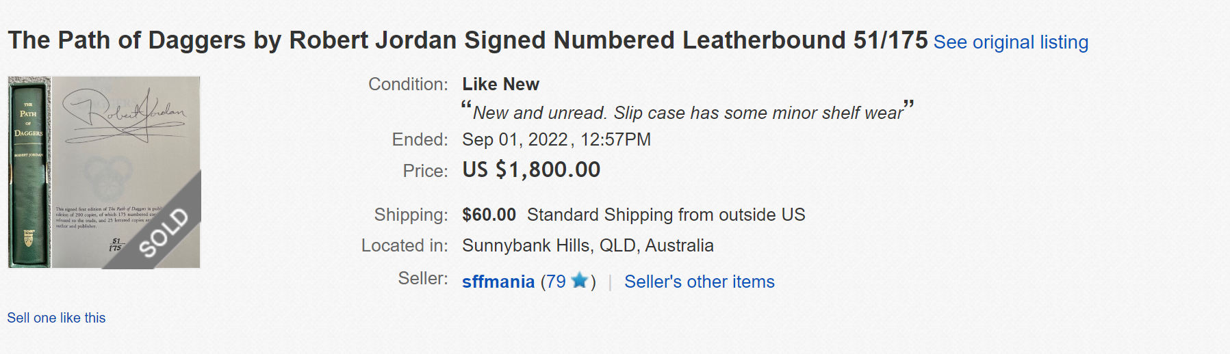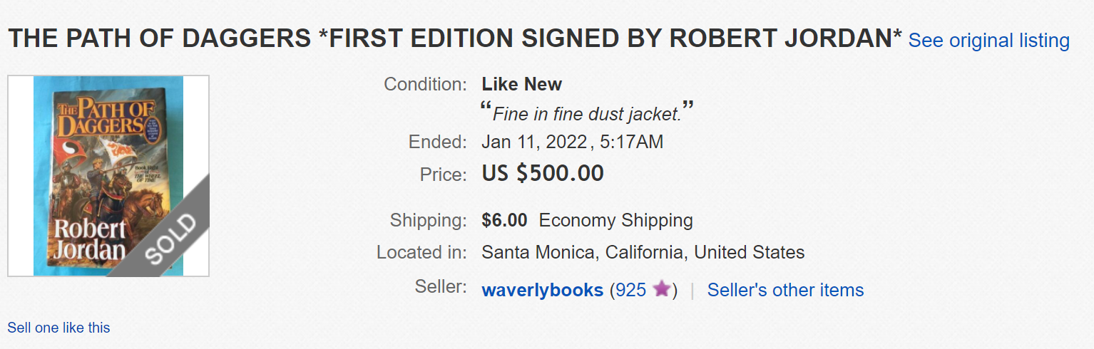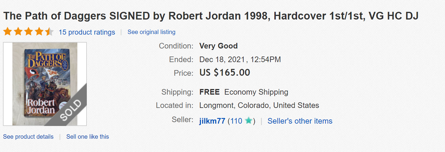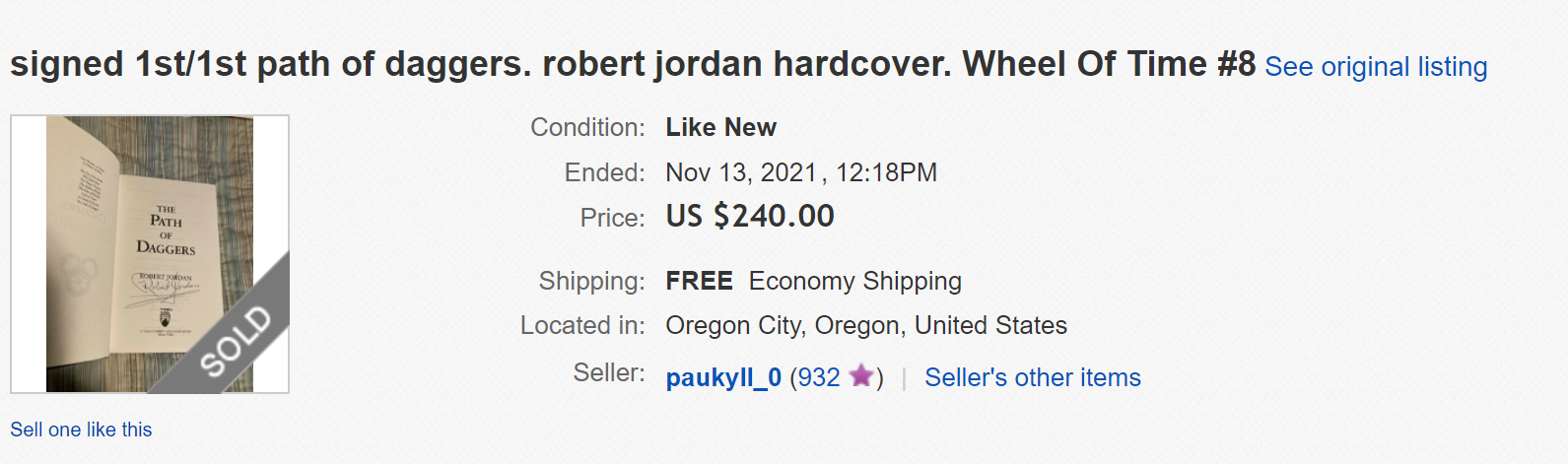 Price HistoryNote: We are continuously adding more listings to this page. $500.00 January 11, 2022First Edition, First Printing of The Path of Daggers in Like New condition. Signed on the title page. $240.00 November 13, 2021First Edition, First Printing of The Path of Daggers in Like New condition. Signed on the title page. $225.00 November 19, 2021First Edition, First Printing of The Path of Daggers in Very Good condition. Signed on the title page. $224.99 November 12, 2021First Edition, First Printing of The Path of Daggers in Like New condition. Signed on the title page. $200.00 October 28, 2021First Edition, First Printing of The Path of Daggers in Like New condition. Signed on the title page. $165.00 December 18, 2021First Edition, First Printing of The Path of Daggers in Very Good condition. Signed on the title page. $150.00 January 18, 2022First Edition, First Printing of The Path of Daggers in Like New condition. Signed on the title page. $1,800September 1, 2022Limited Edition Leatherbound of The Path of Daggers in Like New condition. Signed.