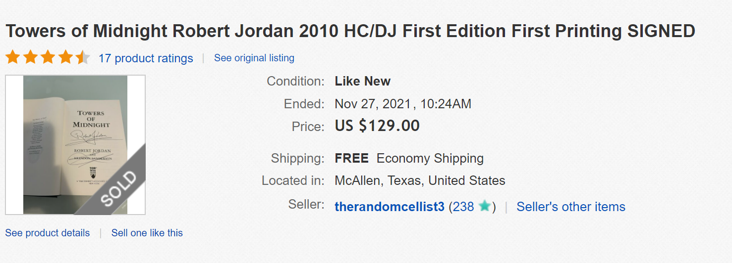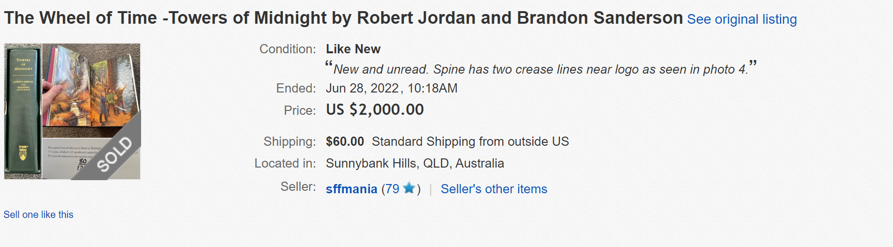 Price HistoryNote: We are continuously adding more listings to this page. $129.00 November 27, 2021First Edition, First Printing of Towers of Midnight in Like New condition. Signed by Brandan Sanderson, facsimile signature of Robert Jordan. $2,000June 28, 2022Limited Edition Leatherbound Towers of Midnight in Like New condition.